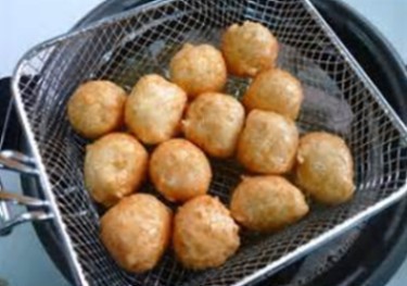 初步工程完畢,他在鍋底加火讓鍋水滾開。待至鍋中之花枝丸子浮出水面,隨即打撈出鍋放入冰水中,好讓其組織緊急收縮增進口感。不銹鋼盆內還有一些花枝肉漿,阿松與我將它搓揉成兩頭尖的梭子型花枝條,以及做出許扁圓型的甜不辣魚板。萬事OK再度生火熱鍋熱油,準備油炸花枝丸子和花枝甜不辣魚板。鍋內油滾溫度已夠,隨將花枝丸子倒入油鍋中開炸。