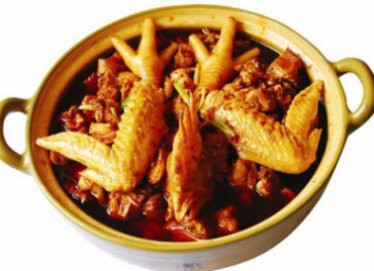 另有一味「干鍋雞」也充滿故事張力,此味來自黔東苗寨料理。當地苗族盛行「百雞之宴」,每逢難婚嫁之日祭拜天神之時,寨民傾巢而出狩獵山雞。然後將所獵獲之山雞悉數宰殺,將雞肉放入置放在玉桂樹下之大鍋內,生火之後苗王揮刀砍木當鍋鏟,邊唱族歌邊翻炒鍋內之雞肉。可能是玉桂花果落入鍋中,結果肉香撲鼻四散飄逸。於是用木鏟在玉桂樹下炒雞肉,就成為「干鍋雞」之來源啦。