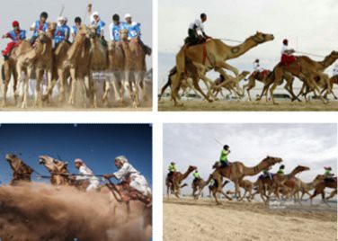不旋踵又是一陣喇叭聲起,但見會場左側出口處,長列走出紅、灰、棕、白等諸色駱駝。五隻同色列為一組,廿隻駱駝是今日競跑之選手。這干駱駝都是經過精挑細選,隻隻之年齡青壯精神飽滿。眾駝繞場一周並向國王致敬,它們動作整齊劃一,隻隻彩布加身非常神氣。繞場完畢廿隻駱駝間隔顏色站在起跑點上,駝背騎士手執長鞭氣勢昂揚。騎士穿著華麗精神枓擞,個個身罩白袍頭戴白巾套以黑圈。
