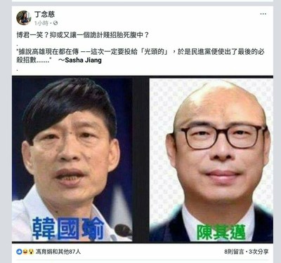 我在新聞一直看到,國民黨立委林奕華拿著教科書--公民與社會,她上報的這本教科書裡面看到的總統只有陳水扁、蔡英文,沒有馬英九,也沒有蔣公、經國先生、孫運璿和國父,甚至看到所有的民進黨裡面的人,才發現到民進黨利用政治介入教育,把民進黨的黨徽放在教科書的封面上,不斷的相信林奕華委員說的句句屬實,實質上民進黨的人在搞台獨,利用一個孩子來達到目的,實在令人不齒!