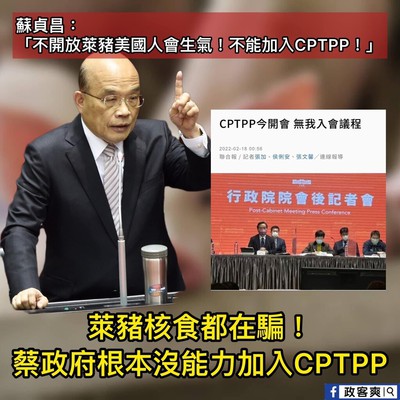 上回,看到蘇貞昌在公投演講的時候,居然還說「毒豬沒進來,會讓美國人生氣!不能加入CPTPP」,如此卑劣的說法,實在讓我身為年輕人難以相信!就為了搞交換條件,來傷害老百姓的身體健康嗎?太不識時務了!