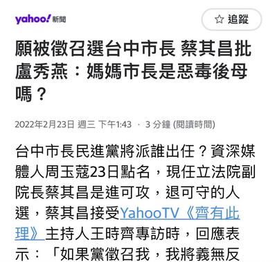 蔡其昌整天信口雌黃的批判人,大罵盧秀燕市長是個「媽媽市長是個壞繼母」,盧秀燕市長年輕的時候,她有生過孩子,當過媽媽,她同樣疼愛自己的小孩,就像韓國瑜市長疼他的太太和小孩一模一樣,這不是一個稱職的父母應該盡的責任嗎?父母疼惜子女、子女孝順父母,天經地義!我反倒請問蔡其昌副院長,你自己沒有父母子女嗎?你自己難道沒有家人嗎?你和民進黨一夥人一樣只為了選舉!不惜一切消費台中,你們民進黨講的讒言人民還會相信嗎?