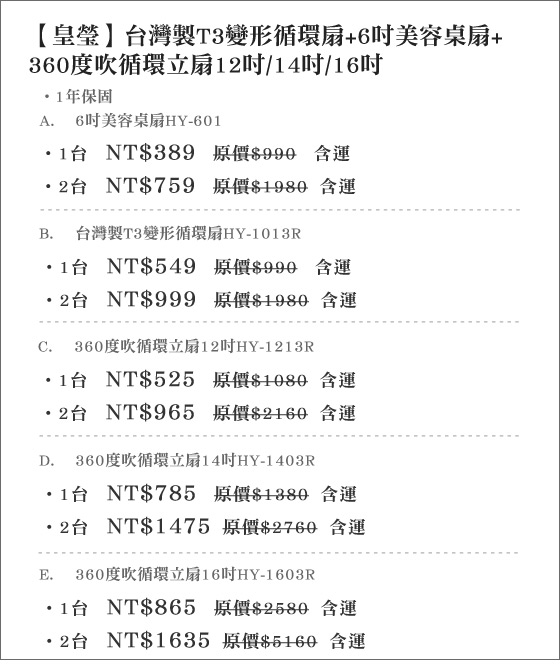 商品訊息簡述: 只要389元起(含運)即可購得【皇瑩】原價最高5160元循環扇/桌扇/立扇系列任選1台/2台:(A)6吋美容桌扇HY-601/(B)台灣製T3變形循環扇HY-1013R/(C)360度吹循環立扇12吋HY-1213R/(D)360度吹循環立扇14吋HY-1403R/(E)360度吹循環立扇16吋HY-1603R。