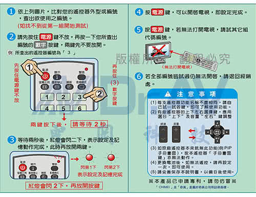 ※ 如原廠遙控器本來就無此功能(例PIP子母畫面),按本遙控器「子母畫面鍵」亦無法動作。