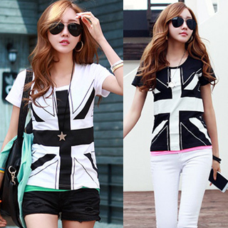 [推薦美人]【EOWYN】米字旗大印純棉修身百搭街頭短袖棉T(黑L-白L-現貨)穿搭推薦 假兩件上衣