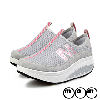 【MOM】透氣網紗增高美腿搖搖經典M字休閒便鞋(灰色)