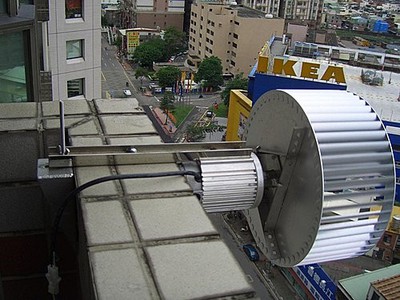 最近在本公司附近看到有同好用多翼式橫流扇當做風力發電機的葉片