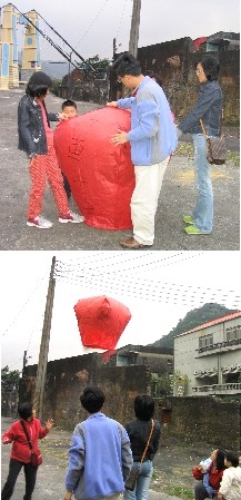 寫好天燈之後,我們拿到吊橋旁的空地去放。熊熊對於被撐開的大天燈及大伯準備點火感到緊張害怕,堅持不肯靠過去,所以由大伯一家合力壓住天燈,讓裡面充滿熱氣; 88放過天燈,則在一旁提供經驗談。雖然害怕,熊熊還是很注意天燈的。當天燈緩緩升空,熊的情緒也由害怕轉為興奮與關心,直到它搖搖晃晃的飄遠到視線之外。後來我們到火車站去上廁所,看到一個紅色的天燈在空中燃燒後墜落,熊還很關心的問:「那是我們的天燈嗎?」