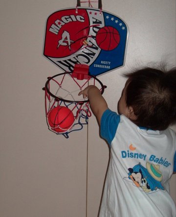 88買了籃框綁在衣櫥上, 於是我家出現了一個灌籃高手! 還可以同時灌進兩球喔!! 另外, 連狗狗玩偶也可以用來灌籃........