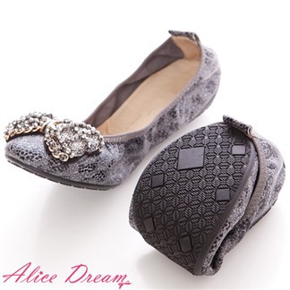 7net購物網Alice Dream 蜥蝪紋牛皮晶鑽蝴蝶結口袋娃娃鞋(灰)bk