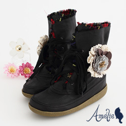 Amelie~甜美氣息-2WAY可拆式花朵格紋內裡短靴-百搭黑