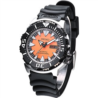 專業級潛水運動錶款,亮麗自信橘色面盤,採用SEIKO穩定的24石(4R36)自動機械機芯,強化鏡面設計可耐水壓,螺旋上鎖式錶把,旋入式背蓋,潛水防水性能深達200公尺,讓你水陸都能來去自如,再搭配精密單向可旋轉錶圈定位功能,可在您運動或潛水時用來定位計時點狀刻度。另指針為螢光加粗設計,讓你在運動時可輕易閱讀時間,專業設計質感極佳,又搭載極佳防水防汗設計的橡膠材質錶帶,輕鬆配戴,不論上山或下海從事休閒活動,都是絕佳的運動良伴,SEIKO已不再是以往的SEIKO,現今的SEIKO將運動與時尚融合並加上本身的造錶工藝,創造更貼近現代新新人類。
