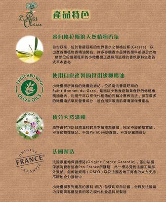 商品訊息功能: 質地溫和細緻採用自家橄欖園冷壓橄欖油製成原裝法國進口