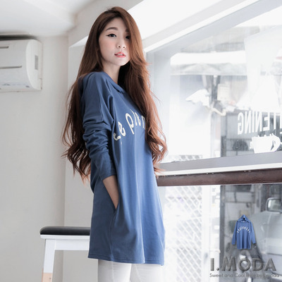 0115新品 怡人典範~英文燙印雙口袋落肩袖連帽長版上衣.2色