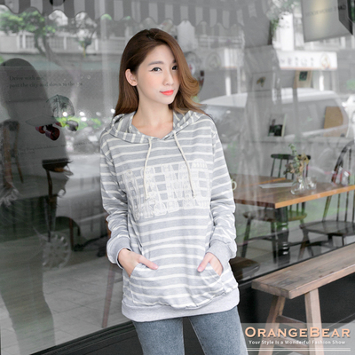 服裝推薦OB嚴選-【甜蜜開春-任選58折】甜氣女孩~條紋拼蕾絲英文字母抽繩連帽上衣.2色