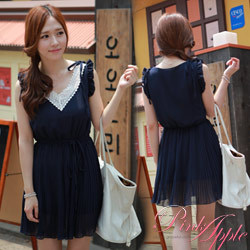 【Pink Apple】花紋領綁帶收腰雪紡洋裝 胸前花紋別緻優雅 花邊拼接肩膀部份 像是花朵一樣迷人浪漫 抓摺感受好看雅緻 綁不綁帶都很好看!