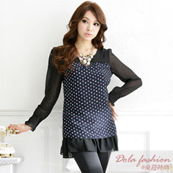 【朵菈時尚】圓領層次點點雪紡衫-寶藍色-中大尺碼