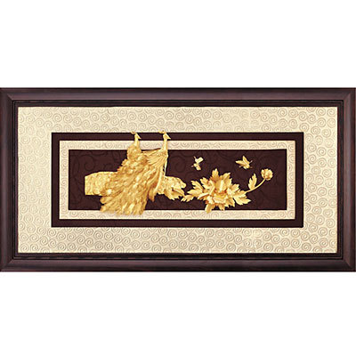 此幅作品採用牡丹孔雀為創作素材,以表現萬象更新,家道昌盛,熱鬧繁華的景象,並且融合傳統手工技法,民族書法藝術,金箔材質,創造具有文化特色的民族工藝品! ~氣派大方又富麗堂皇