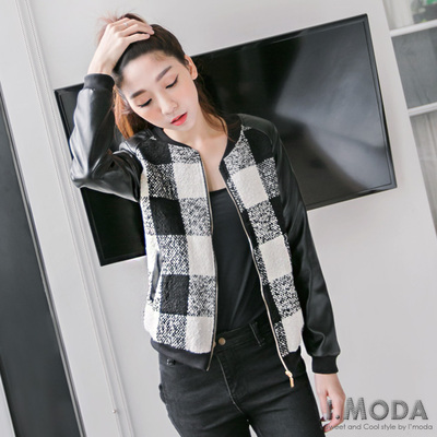個性風尚~格紋軟呢拼接皮革袖羅紋滾邊外套.2色商品訊息簡述: