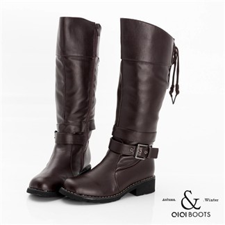 0101馬靴館~後綁帶釦鐶帥氣拉鍊長筒靴(咖)