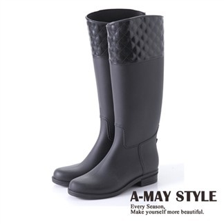 (艾美時尚)菱格弧口舒適長筒雨靴-黑