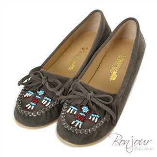 (BONJOUR)刺繡moccasin~流蘇舒適3.5cm內增高莫卡辛平底鞋-灰