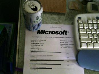 前幾天去考了微軟的MCDST考試 第一次考原文的考試,亂緊張的 電腦還給我當了兩次 考了兩個多小時後出來分數還是不及格 鬱卒....難道遇到英文的考試我就一定死嗎?? 唉...