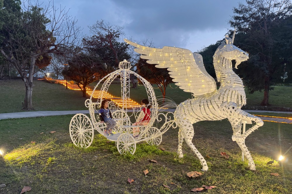▲飛馬馬車主燈點亮大陳公園夜色,孩子坐上馬車合影,成為親子賞燈必拍打卡點。(圖來源/花蓮縣環境保護局)