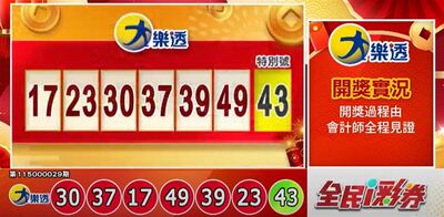 補財庫三司財庫官廟大樂透第115000029期獎號,由小到大為17、23、30、37、39、49,特別號43。