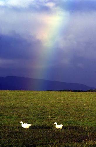 前幾天去屏東,走山路。有點迷路。 原來是要拍些屏東特有的白色乳牛,但一直找不到牠們。 但卻意外的發現這片草原。 這時飄雨又出了太陽,一道肥肥的彩虹從天而降。 天很藍,草很綠。二隻白鵝,意外出現...