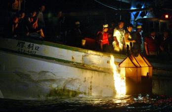 水燈很小,但船上的人都以一種靜肅又安祥的態度,施放屋形水燈,更有人雙手合什。心意有了,何必在乎水燈的大小?