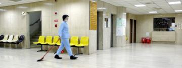 一位清潔阿桑拖著掃把走來走去。沒有什麼病人、訪客,地板也就相對發亮乾淨。