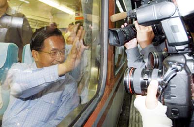 阿扁坐在自強號內,我們擠在車站月台上。