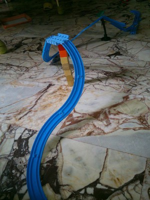 科學168回來,一進門就看到千聞排的鐵道,不同以往的平面,今日利用積木堆高而有高低起伏,似雲霄飛車。