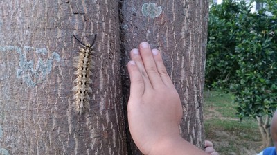 母子三人開學的苦悶,在第三天有了出口。在社區小葉欖仁樹上發現了幾乎快跟小孩手掌大的毛毛蟲,有著偽裝色,還好小孩子眼睛晶亮才發覺它的存在。據說這是一隻母的、三齡狀態的青黃枯葉蛾毛毛蟲。其實我倒沒多關心什麼蟲,而是珍惜他們晶亮的眼睛,我想再過個幾年,這些晶亮好奇的表情或許會成為黑沉沉的無奈。不知道為什麼,學校、社會期待是以苦行僧方式對待小孩? DSC_3633.jpg