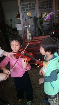 或許是受到LUGA家三姊弟的影響,閱一直吵著要學小提琴。鑒於先前老大學習鋼琴半途而廢的前例,對於閱的要求一直很推託以對,然終究拗不過他的跳針式要求,僅能跟他說從鋼琴學起,至少要有個音階的概念才好上手。閱對音樂的喜愛似乎更堅強,快快樂樂彈琴後仍不忘小提琴,甚而鼓動千聞,而有了兩兄弟一起拉小提琴的畫面。