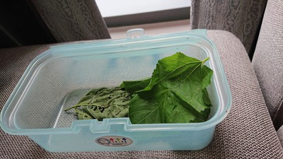 於是乎,新竹台北這趟三天出遊,我們有了十來個小同伴,每日早晨的點名,難過的發現一兩個小同伴僵硬的身體,最後只能移除他們將他們留在新竹的山區。在人為飼養下,仍無法避免生命的死亡,那些在大自然風吹日曬、天敵環伺的蟲子們的一生可沒有安逸舒適,每一個時刻應當都是響著戰鬥的鼓聲,懈怠不得。老大願意不嫌麻煩背著他們出遊,在一路上我們警醒著摘取桑葉補充牠們的食物,從摘取不美味的老葉到換成鮮嫩新葉;故意讓背包留個縫隙讓牠們多一些空氣;下榻飯店時趕快從背包將飼養箱取出,讓它們重現天日。這一些舉動,我看在眼裡,心中難免有所感:他理解飼養動物不是一時有趣,他漸次感受到掌握生命時應當更溫柔謙和。
