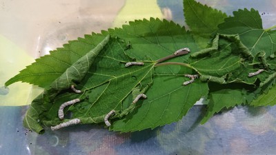 團體生活中要抽出空摘桑葉給這群小傢伙,想來有所困難,所以出門之前,他把這些傢伙託給我了。說真的,養著養著,真有一種當阿媽的感受,怕他們病著了,於是乎每日起床第一件事便是打開飼養箱點兵,1, 2, 3......數道13才放下心來;怕他們餓著了,每日早晚兩趟摘取桑葉,三餐餵養;怕牠們危險,飼養箱得隔水置放,以免螞蟻攻擊。每當換上新葉時,順手清理糞便,可以很輕易地察覺牠們食量愈來愈大。