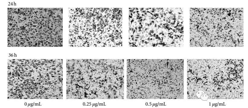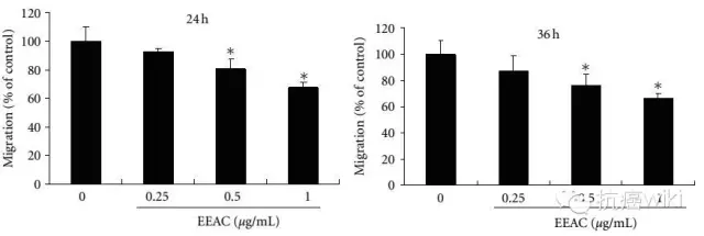 CL1-5細胞用EEAC(0.125、0.25、0.5和1.0μg/ml)處理24h,並對transwell遷移細胞進行計數(B);用光學顯微鏡(200×)進行拍照記錄