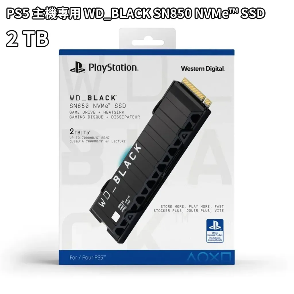WD_BLACK SN850 NVMe SSD 固態硬盤PS5授權版採用了與自家其他產品黑色風格外包裝截然不同的藍白配色,加印了PlayStation logo,更加凸顯出PS5授權版的獨特之處,此外就是標準的產品特寫及產品相關介紹,從介紹中,我們可以看出,該SSD還標配了散熱片,容量為1TB,讀取速度可達7000MB/s。
