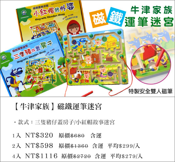 商品訊息簡述: 平均每入最低只要279元起(含運)即可購得【牛津家族】磁鐵運筆迷宮任選1入/2入/4入,款式:三隻豬仔蓋房子/小紅帽故事迷宮。
