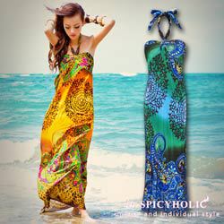 【SPICYHOLIC】南洋風味‧變形蟲綁脖長洋裝(冷色藍)