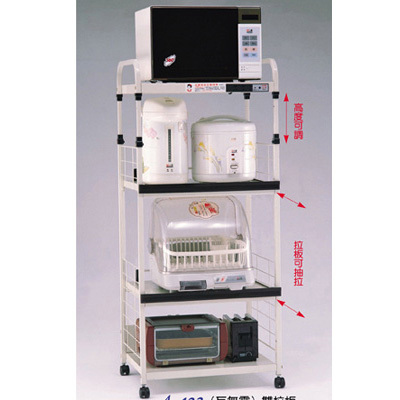 《愛樂美》自動斷電二拉四層可調整安全電器架 商品特色:一、自動斷電,防止電線走火,插座在前面,斷電看得見,復電最方便。二、鍍鋅鋼板不怕水、不怕蒸氣、永不變型。三、超厚專利滑軌,拉板不會脫落,清洗最方便。