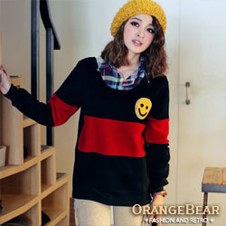 【OB嚴選】格紋x橫紋笑臉圖案內磨毛T恤 毛毛笑臉圖案,看起來很Cute吧~!!
