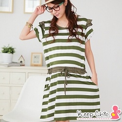 【Keep Chic孕婦裝】綠色寬條紋款特色縮腰孕婦洋裝 簡單的款條紋 讓你休閒又可愛唷 縮腰綁帶設計媽咪更加舒適