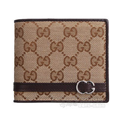 GUCCI 經典LOGO緹花布GG金屬環短夾(咖啡) |