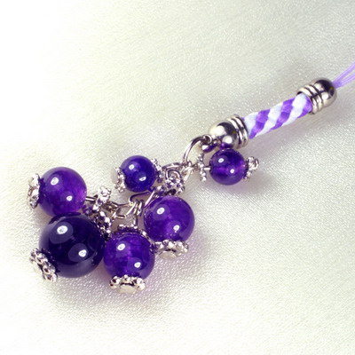 | 紫晶葡串手機吊飾 ◎紫晶葡串寓意完滿,紫水晶圓潤潔淨,巧妙搭配於手機或皮包上皆能一展您的優雅。 ◎手工精心製作,讓您感受老店的堅持。