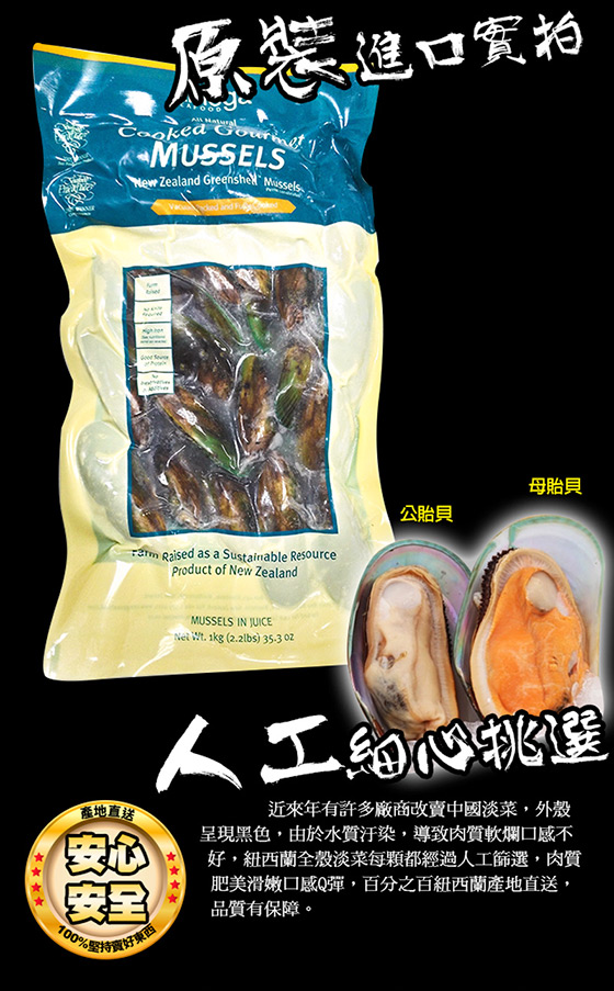 宅配百分百紐西蘭原裝進口全殼淡菜,顆顆經過人工細心篩選,味道鮮甜,肉質爽口,簡單烹煮就好吃,老饕必吃珍味