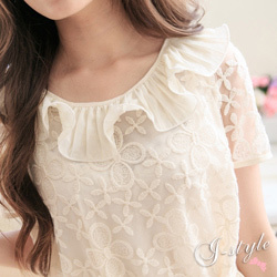 領子是立體波浪的浪漫弧度~正面是刺繡花朵網紗~A-LINE娃娃版型與綁帶~好穿也很修飾唷!