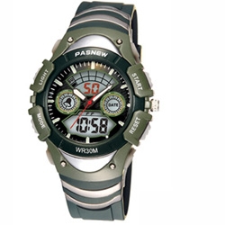 PASNEW 繽紛多功能雙顯電子行針錶-墨綠/44mm